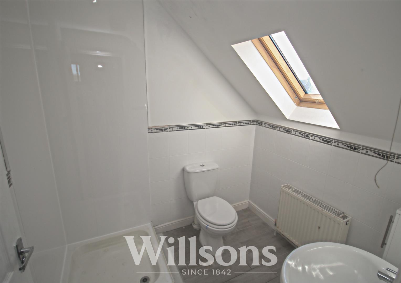 Equipped with wc and wash hand basin, cupboard, radiator, half tiled walls, space and plumbing only for a shower cubicle (note: the cubicle and shower have been removed), velux rooflight, radiator, tiled floor.