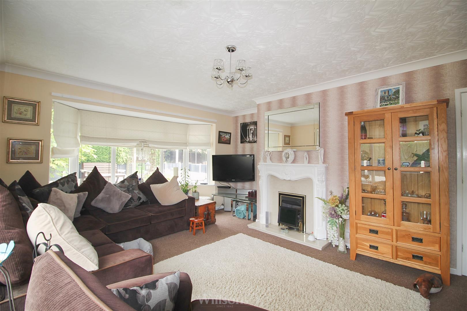 With internal single glazed timber door leading to the hallway, feature fireplace with inset gas fire, carpeted flooring, bay window to the front and window to the side of the property.