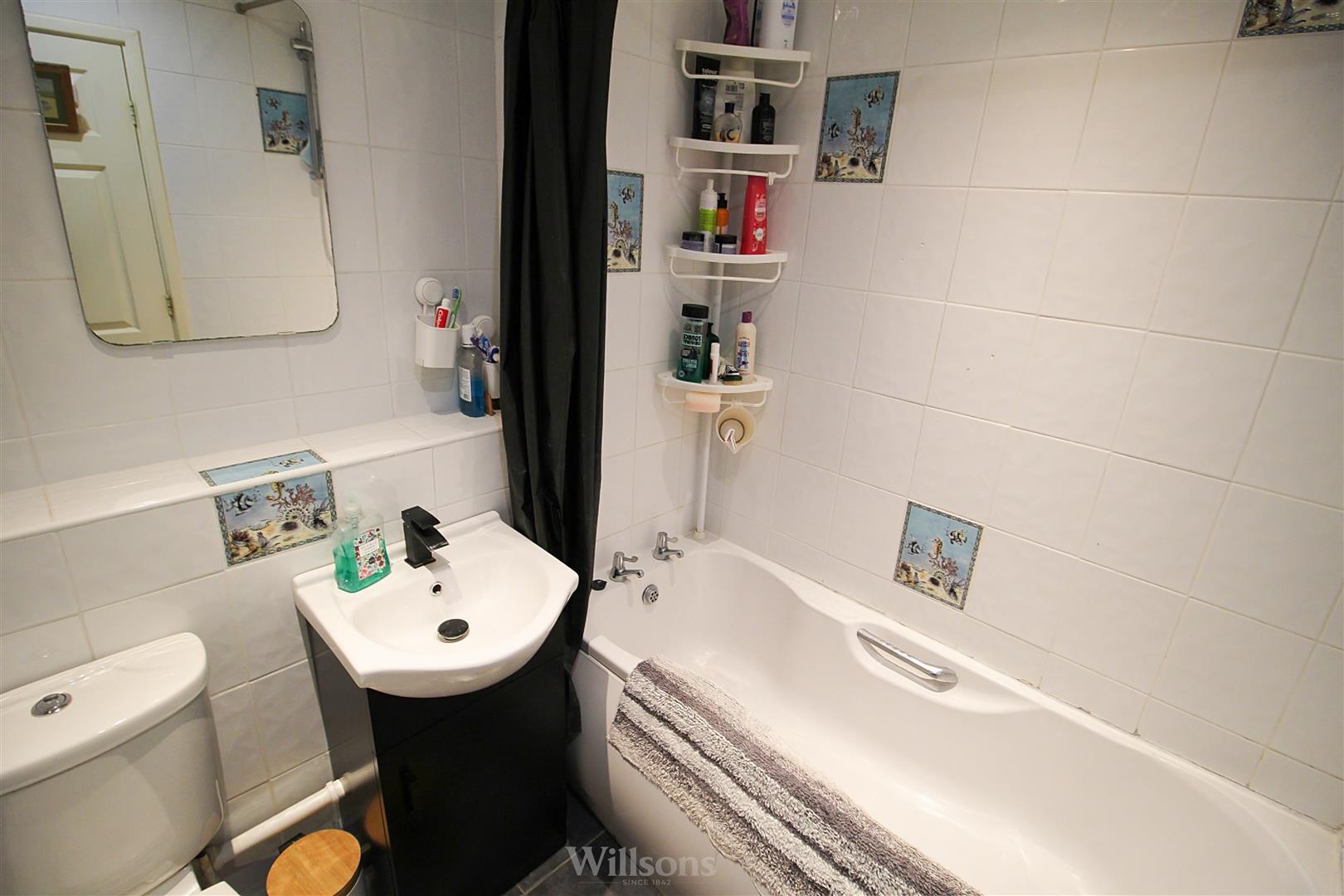 With bath having electric shower over, sink, WC, extractor fan, fully tiled walls, tiled flooring and heated towel rail.