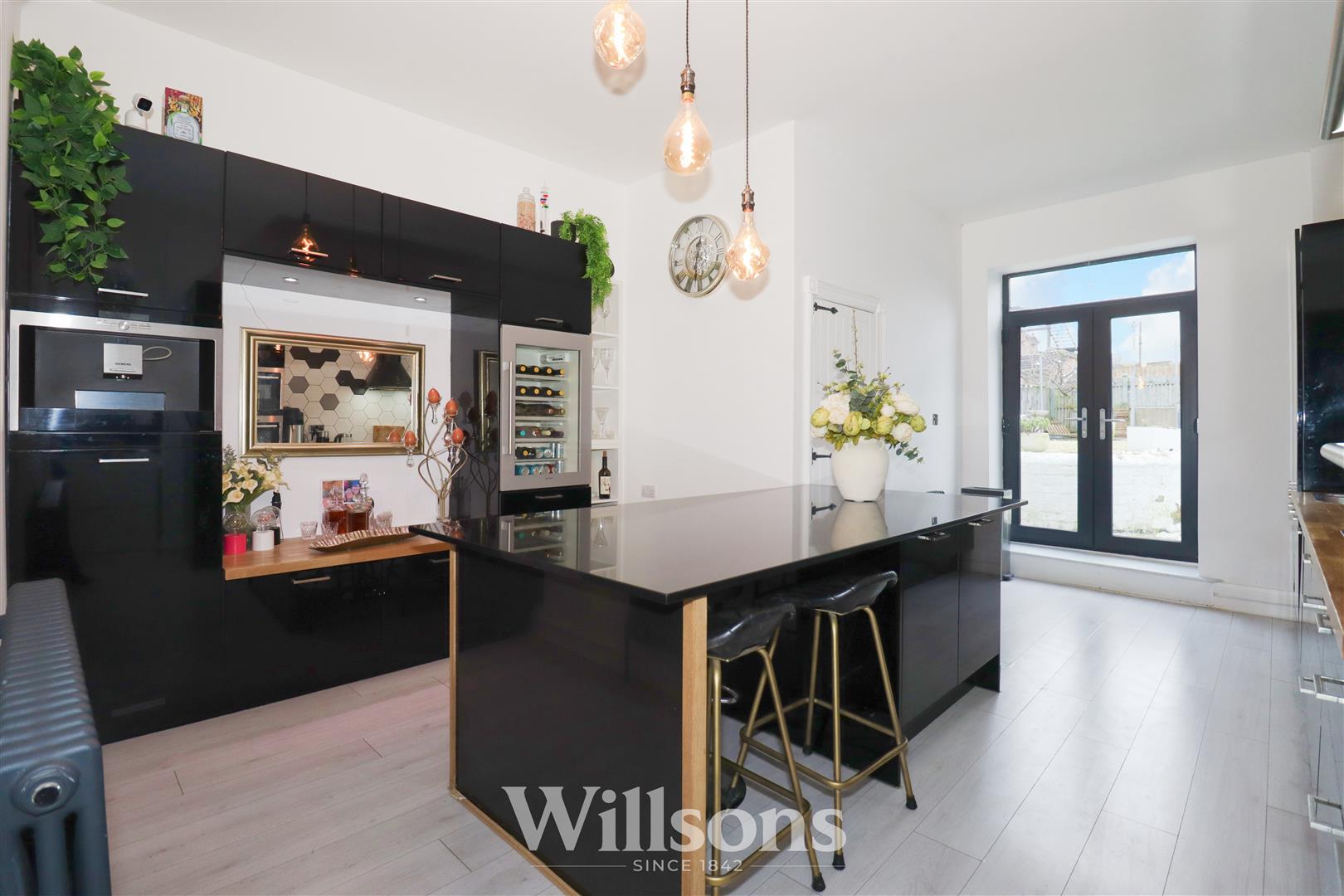 ‘L’-shaped kitchen with a range of wall and base units, central dining island with marble worktop, feature pendant lighting and four integrated storage cupboards below, integrated appliances by Siemens to include coffee machine, eye level wine refrigerator, oven and microwave, ceramic hob with Klarstein circular extractor hood over and wide pan and appliances draws below, seperate bank of wide draws to include crockery draw, integrated dishwasher, sink with 1.5 bowls and spray mixer tap, integrated full height fridge, solid wood worktops, two Victorian style radiators, partially tiled walls, laminate flooring and French doors to the rear courtyard.
