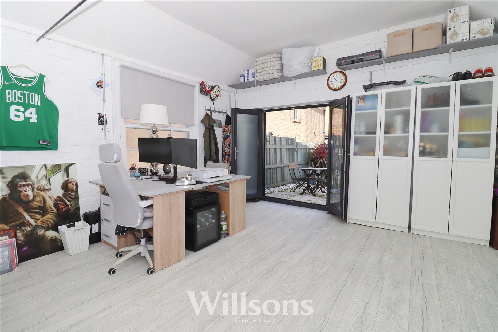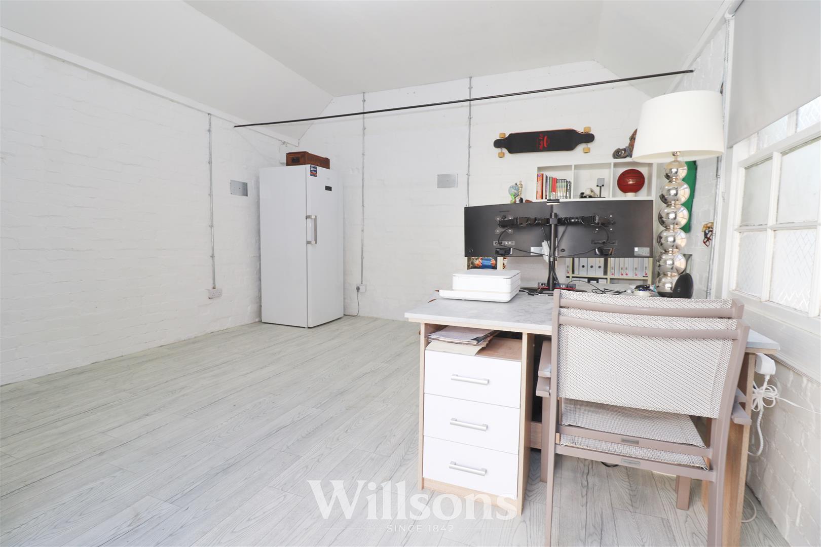 Generously sized brick-built outbuilding with high partially vaulted ceilings, independent fuse box, power and lighting, currently utilised as a home office workspace with uPVC French doors to the patio garden and wooden single glazed window to the side offering a dual aspect light bright workspace with hard wearing commercial grade vinyl flooring.