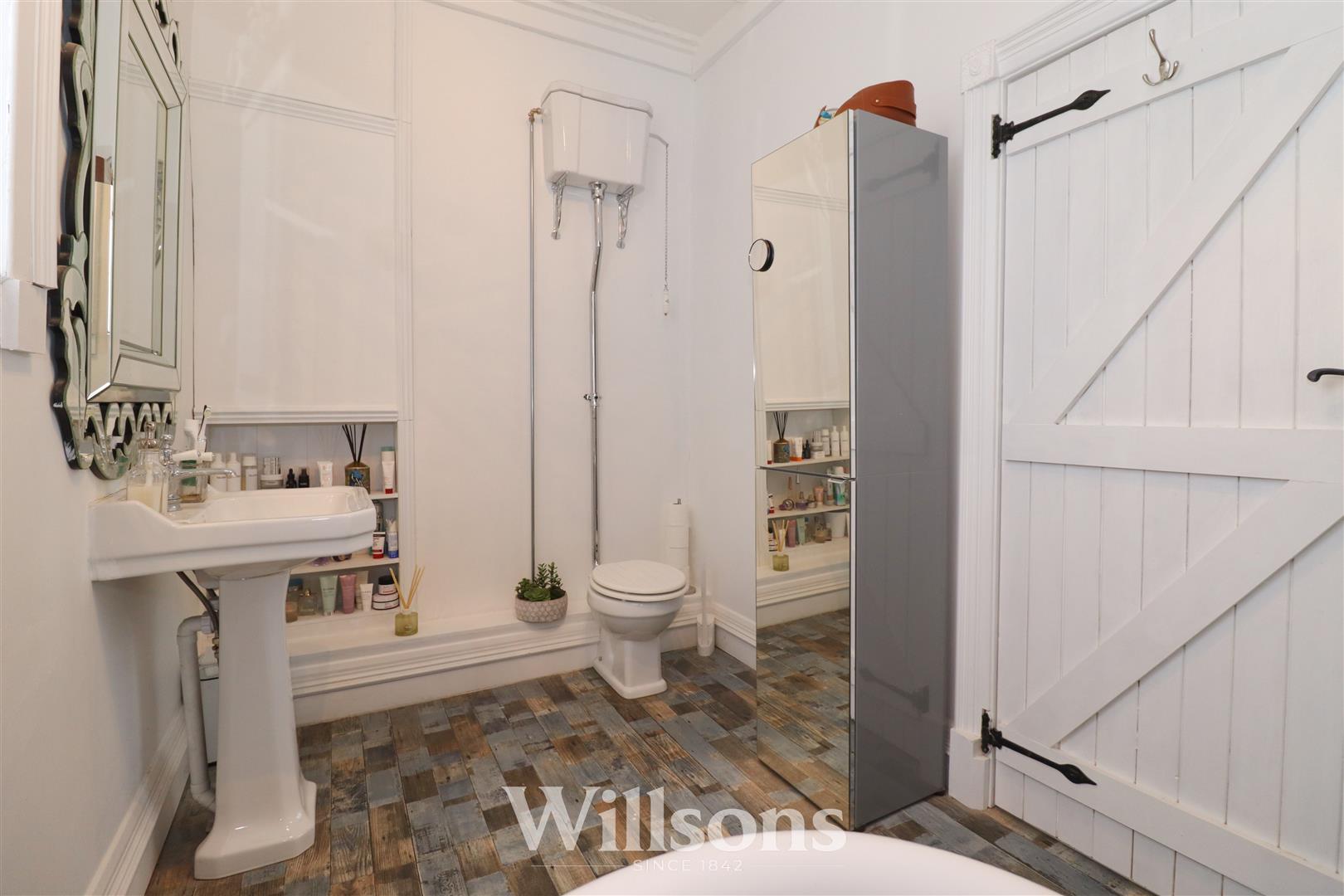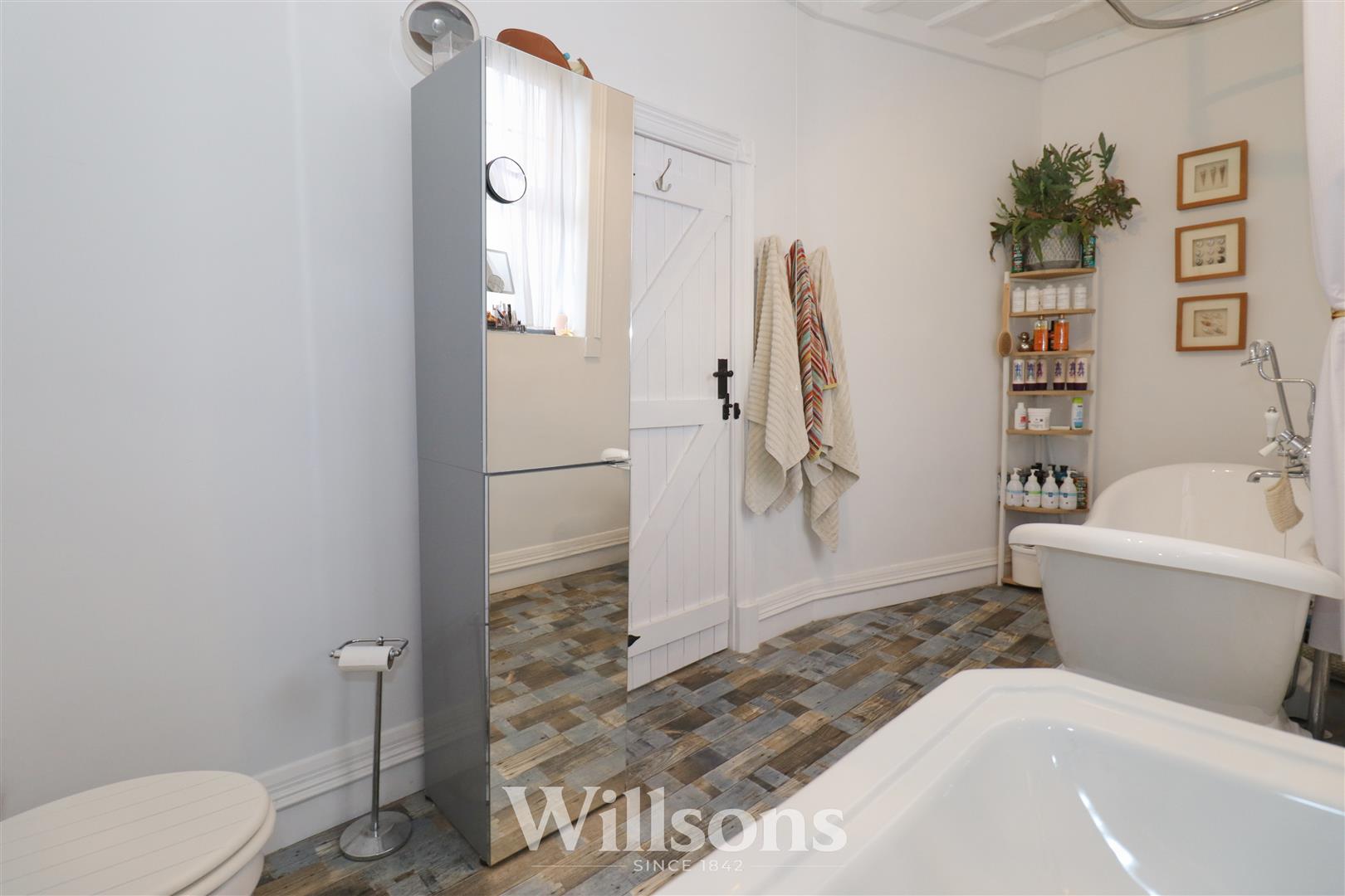 With Victorian style bathroom furniture to include freestanding roll top slipper bath with mixer tap, hand cassette and wrap around chrome shower rail and curtain, wash basin with mixer tap, WC with traditional high level cistern, built-in shelving to one wall with concealed space housing gas combination boiler, wood grain effect vinyl cushion flooring and window with feature Georgian bar.