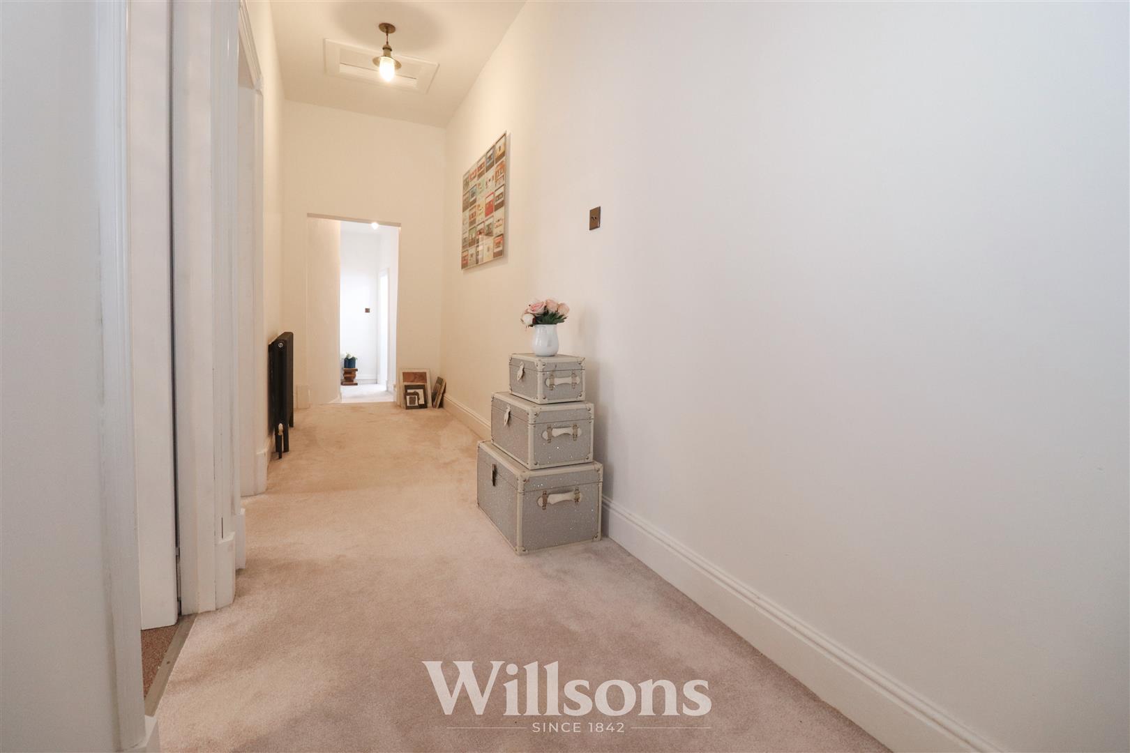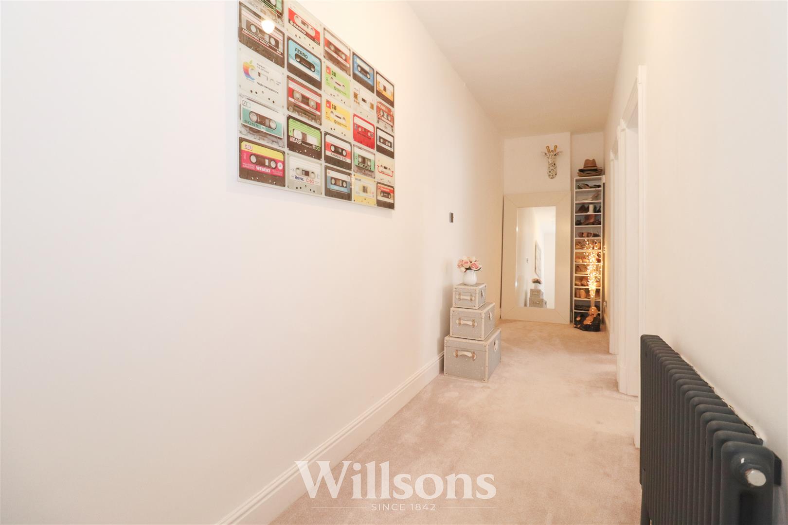Split level hallway with carpeted flooring, two radiators, loft access, airing cupboard (1.1m x 0.9m) with decorative screen door and built-in shelving.