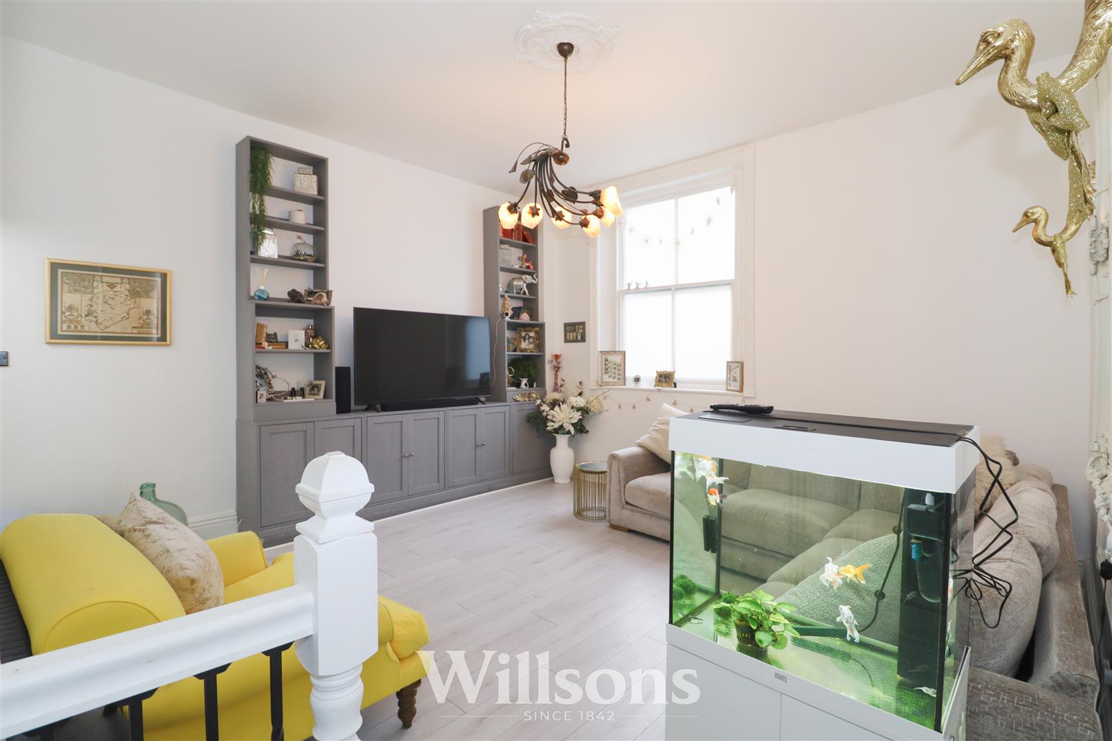 An incredibly spacious living room with ceiling height of 3.3m, full span fitted media wall, Victorian style radiators, laminate flooring and large single glazed Georgian bar sash window to the front of the property.
