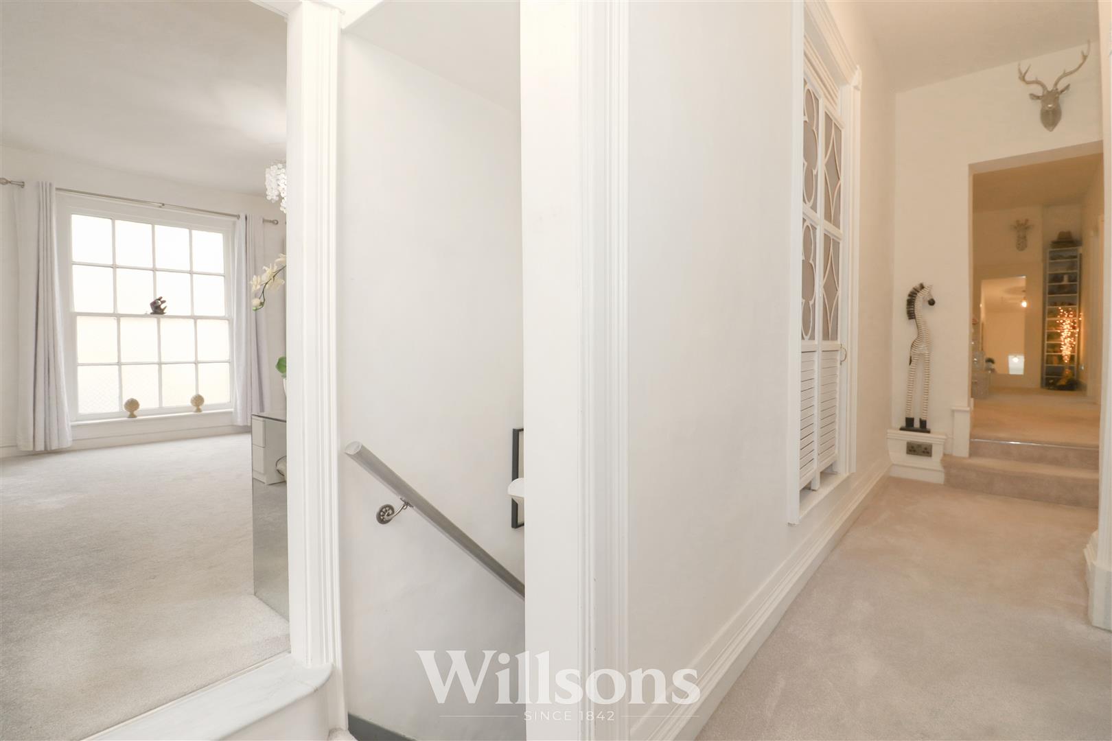 Split level landing with high level storage cupboard and loft access, feature globe pendant cluster ceiling light, carpeted flooring. and window with Georgian bar to the side aspects.