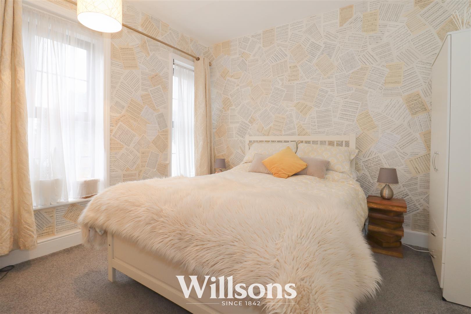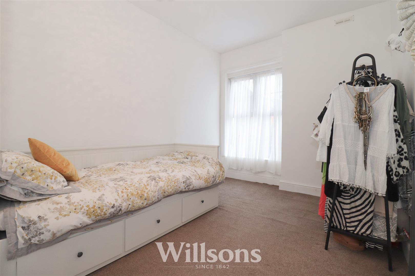 Of generous proportions to include ceiling height of 2.6m, central wide chimney breast wall, over stairs fitted wardrobe with hanging rails (1.3m x 0.8), Victorian style radiator, carpeted flooring. and wide full-height single glazed Georgian bar sash window with low level windowsill.