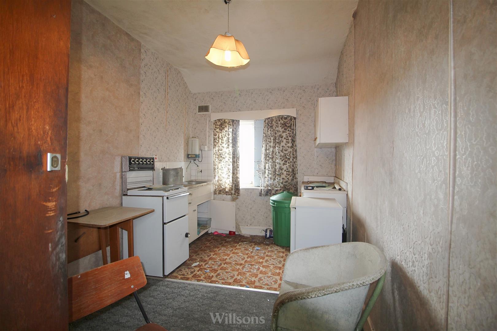 With a range of base and wall units, stainless steel sink, electric water heater, vinyl & carpeted flooring, window to the rear of the property, dividing wall and doorway leads to the bedroom/store area.