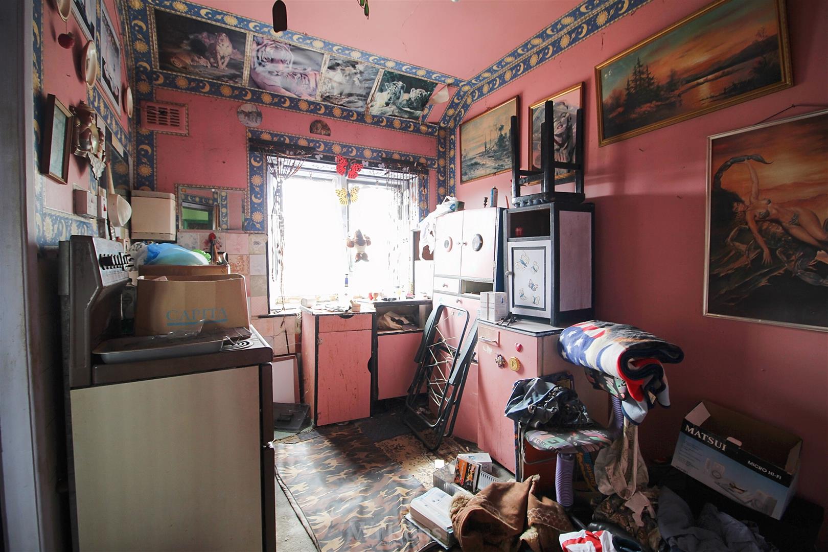 With carpeted flooring, stainless steel sink and kitchen base units housing the electric consumer board and meters, window to the front of the property.