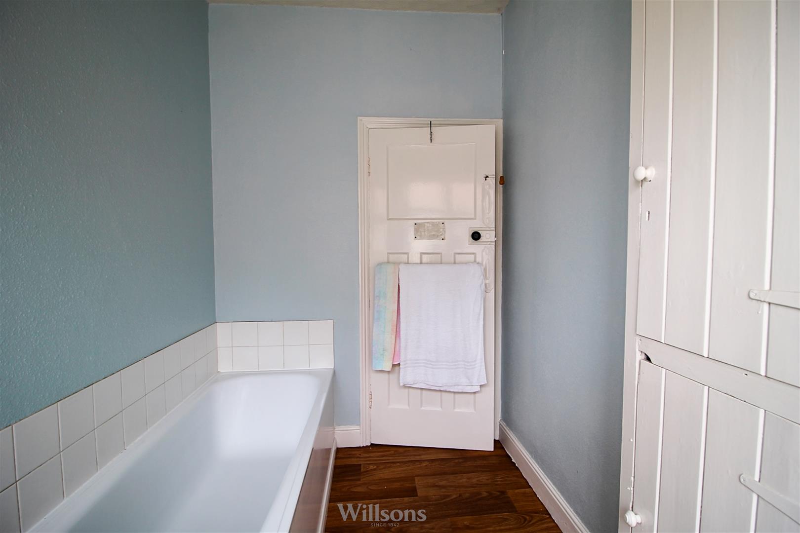With sink, bath, double airing cupboard housing immersion cylinder, vinyl flooring and window to the side of the property.