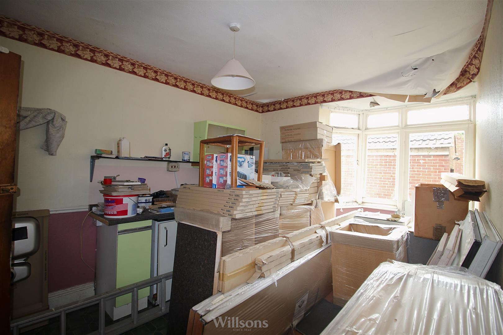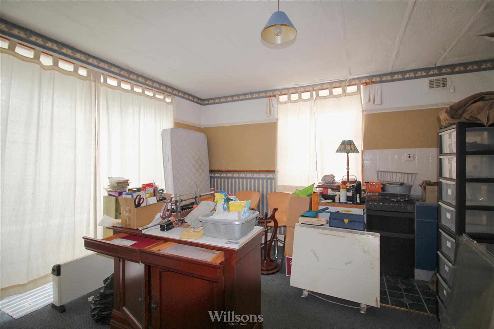 With carpeted flooring, window to the side of the property, internal dividing wall giving access to kitchen area with a range of base and wall units, stainless steel sink, electric water heater, vinyl flooring, window to the rear and door to the rear hallway.